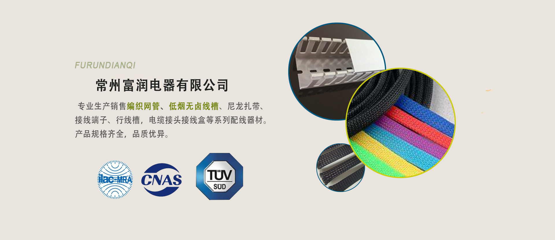 常州富潤電器有限公司專業(yè)生產(chǎn)、銷售編織網(wǎng)管、尼龍扎帶、接線端子、行線槽,電纜接頭接線盒等系列配線器材···